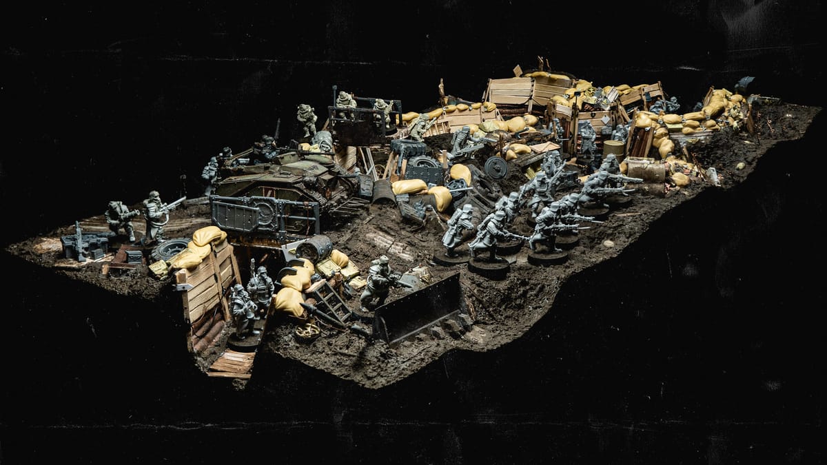 While the first board focused on a winding network of trenches, I aimed to try something different with this one, all the whilst still maintaining visual cohesion between the two. This second diorama is the exact same size as the first (30×30 cm). However, the layout is more open with varying levels to add depth and variety to the scene, in contrast to the other, which primarily consists of fortifications.